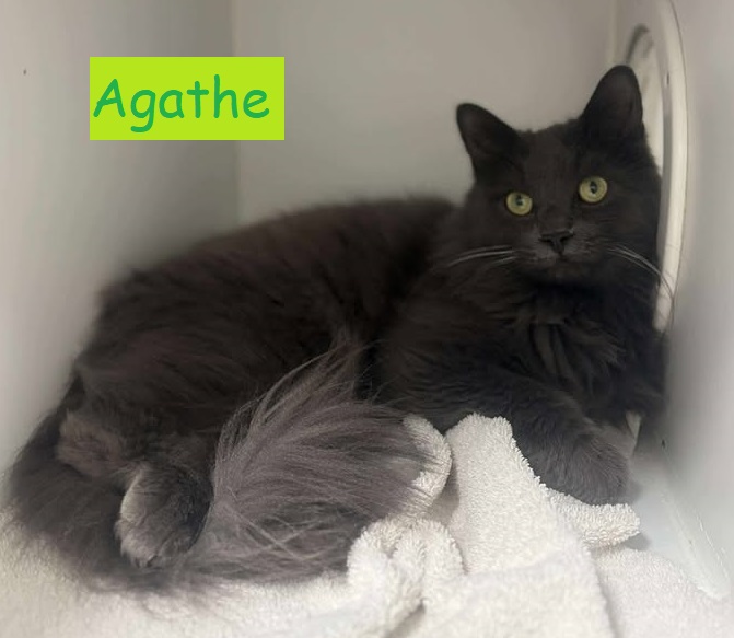 Voici Agathe! Une belle chatte aux yeux verts! Une datte la nourrit dehors pendant 2 mois. Puisqu’elle n’a pas trouvé sa maison et que le temps froid arrive, elle l’a amené au refuge. Elle est très douce, affectueuse...
