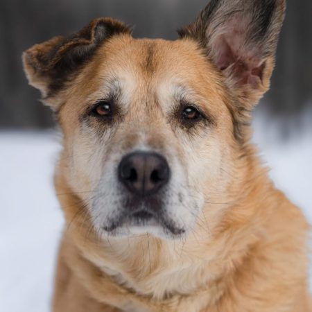 Une jolie femelle d’expérience de type Berger croisé âgée de 11 ans et pesant 40 kg.