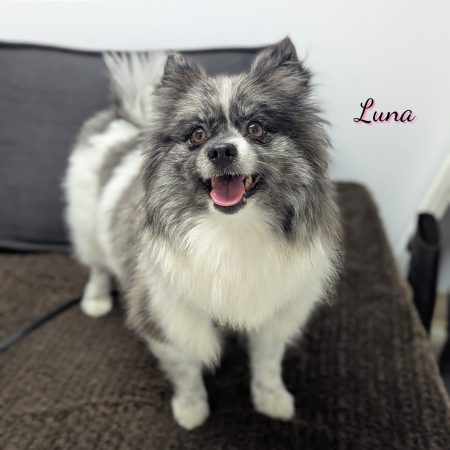 Une superbe femelle de type Poméranien croisé âgée de 5 ans et pesant 6 kg.