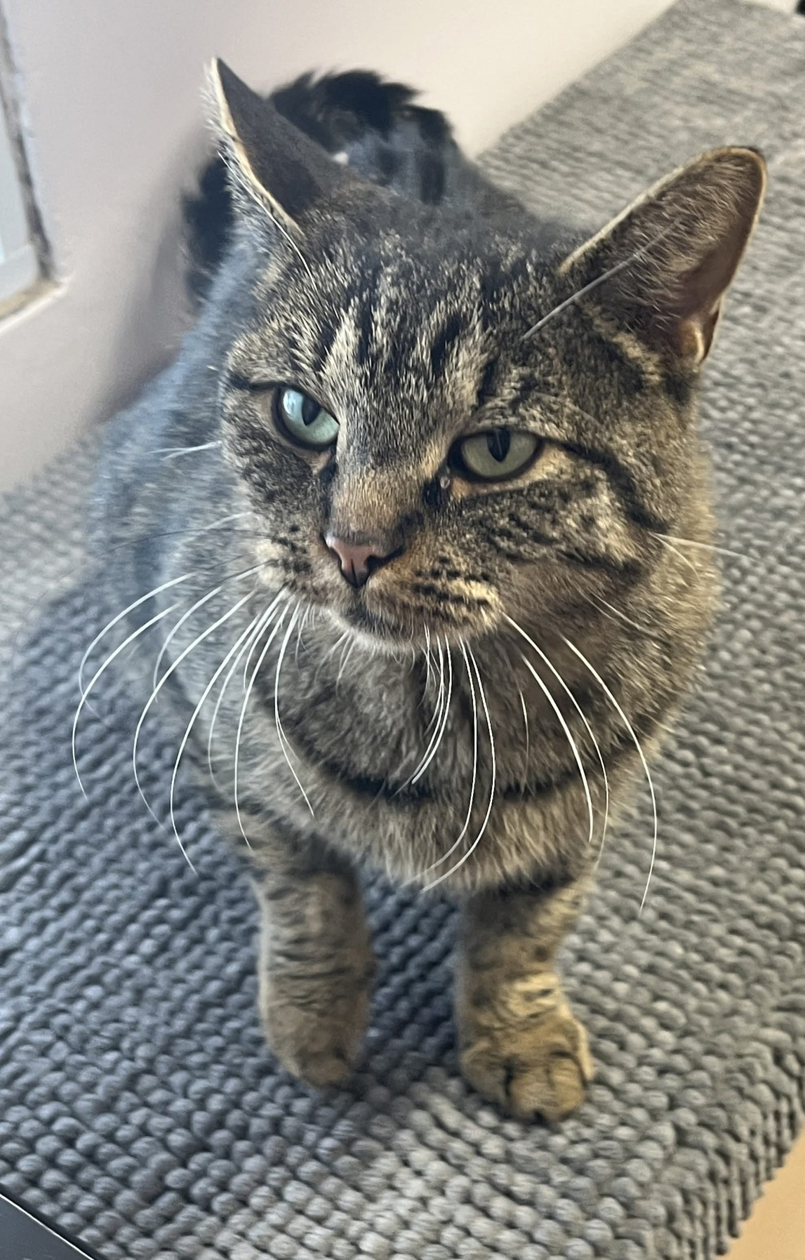 Grenoble est une belle chatte dodue est en excellente santé. Avec son joli pelage tabby et blanc, son adorable nez rose-bonbon et ses grands yeux verts qui expriment...