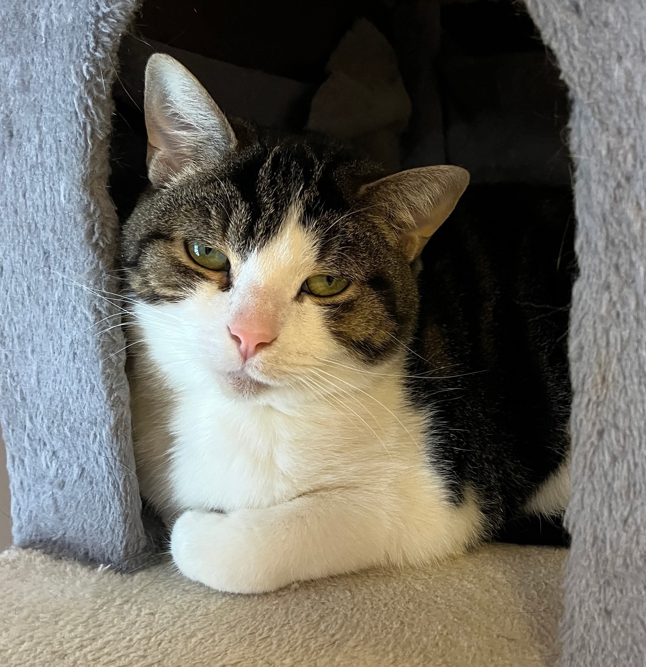 Cayenne est une jolie féline au pelage tabby & blanc et aux grands yeux dorés tristes et mélancoliques. Elle est en très bonne santé malgré un léger surpoids...